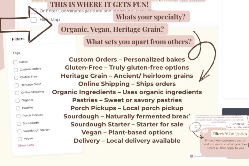Filters help customers search and understand what you offer. Select everything that applies to your bakery so customers can find you by category. This is where you can have fun and be different from other bakers.
