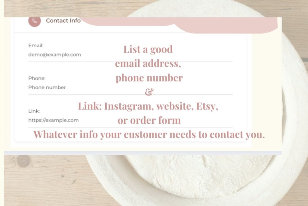Add your phone, email + one main link (Instagram, website, Etsy, order form, etc.).