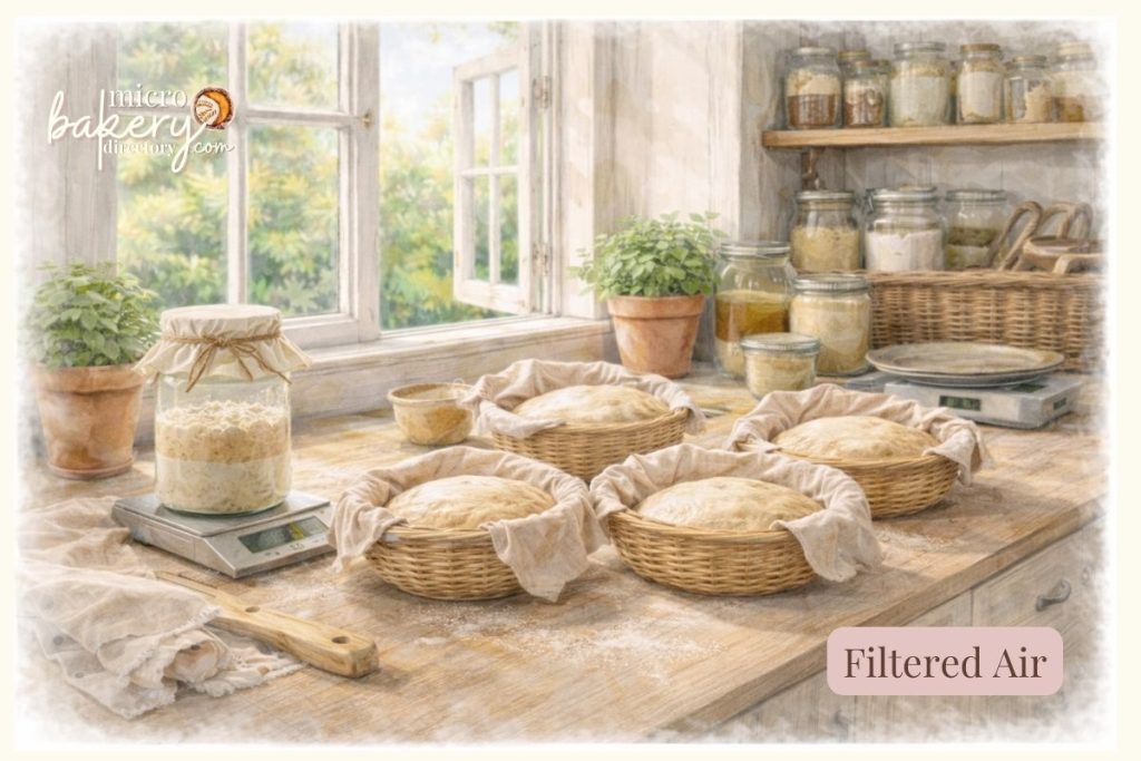 Air filtration does not sterilize or remove the wild nature of sourdough. Instead, it helps reduce airborne pollutants, smoke particles, dust, and contaminants that can interfere with fermentation or settle on dough during long, open-air proofing periods.